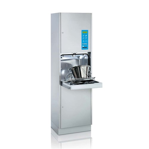 TOPIC stand-alone devices are made from stainless steel to guarantee durability, easy cleaning and hygiene. The deep-drawn wash chamber has no corners or tight angles. The power nozzle system is positioned for the highest efficiency, guaranteeing optimum hygiene for your washware. Bedpans, urine bottles, and commode buckets are emptied, cleaned and disinfected automatically and reliably in a sealed environment. This noticeably reduces the entire care team's workload and they benefit from state-of-the-art convenient hygiene. Get huge savings on your resources and budget with our reliable and low-maintenance TOPIC technology.