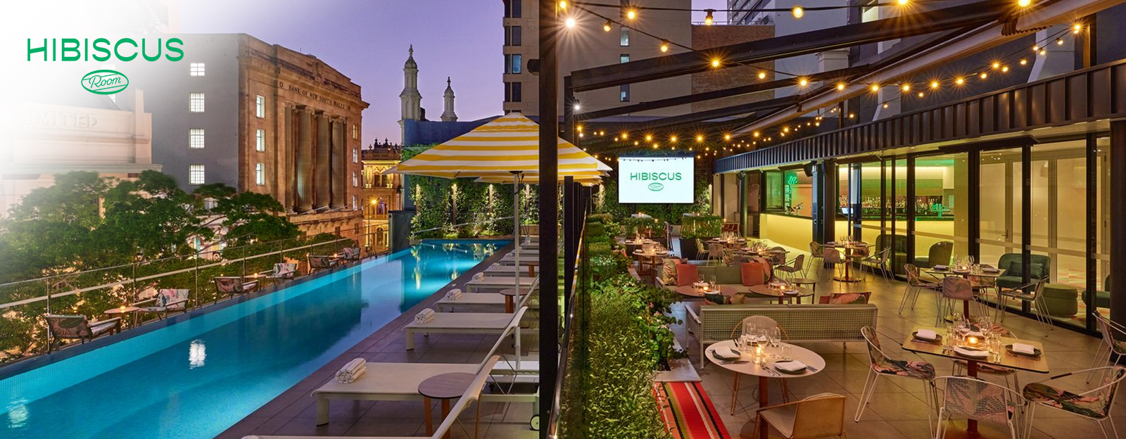 The Hibiscus Bar and Terrace is located on the fourth floor of the Hyatt Regency in Brisbane City. The poolside venue is a popular meeting spot with views of the Brisbane skyline overlooking Queen Street Mall. The Hyatt Regency renovated the Hibiscus Bar & Terrace with a grand opening in 2021 to showcase their new and improved venue.