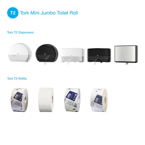 Tork T2 Mini Jumbo dispenser. A modern design with smooth surfaces and clean lines that fits seamlessly in your washroom. Create a great impression that boosts the high-quality image of your facility. Stylish stainless steel with anti finger print coating looks great and stays clean