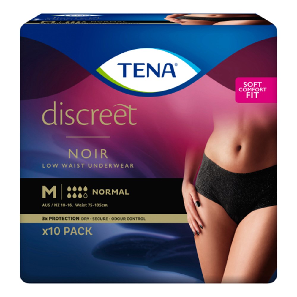 TENA Women's Incontinence Underware, in Noir with lingerie trim waist, is designed to feel just like regular underwear with micro-stretch fabric. These disposable incontinence underwear are designed to protect with an absorbent core that locks in moderate leaks to protect the wearer ensuring discreet protection against incontinence while maintaining and elegant and fashionable look and feel. Two colours in the range - black or creme. Available in Medium and Large.