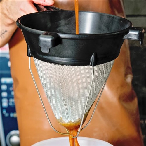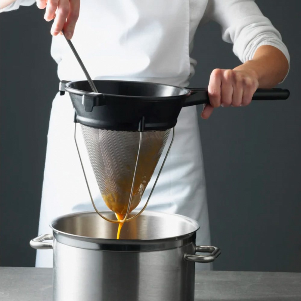 The Exoglass Bouillon Strainer 255mm from Matfer Bourgeat is built for commercial kitchens that demand precision, durability, and efficiency. Constructed with a Exoglass monobloc body and triple stainless steel mesh, it delivers ultra-fine straining for consistently smooth sauces, soups, and stocks. Reinforced with stainless steel cross-wires, the mesh cone is safeguarded against impact and heavy handling.