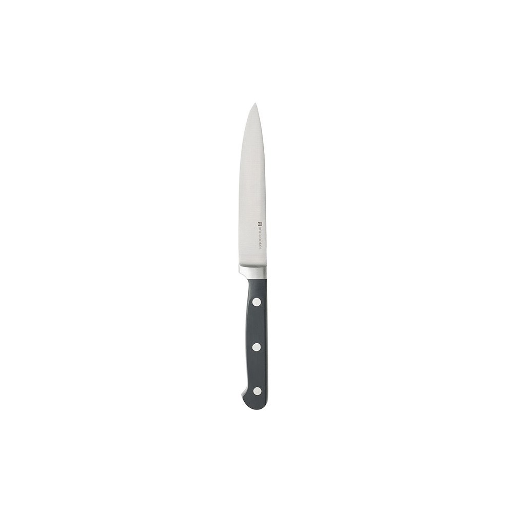 The Qualicoup Paring Knife 90mm Pro.cooker is a high-quality yet affordable kitchen essential. Featuring a sharp stainless steel blade, this knife ensures precise cutting for all your paring tasks. Its three-rivet solid bolster handle provides strength and stability, while the ergonomic design offers a comfortable and secure grip for extended use.
