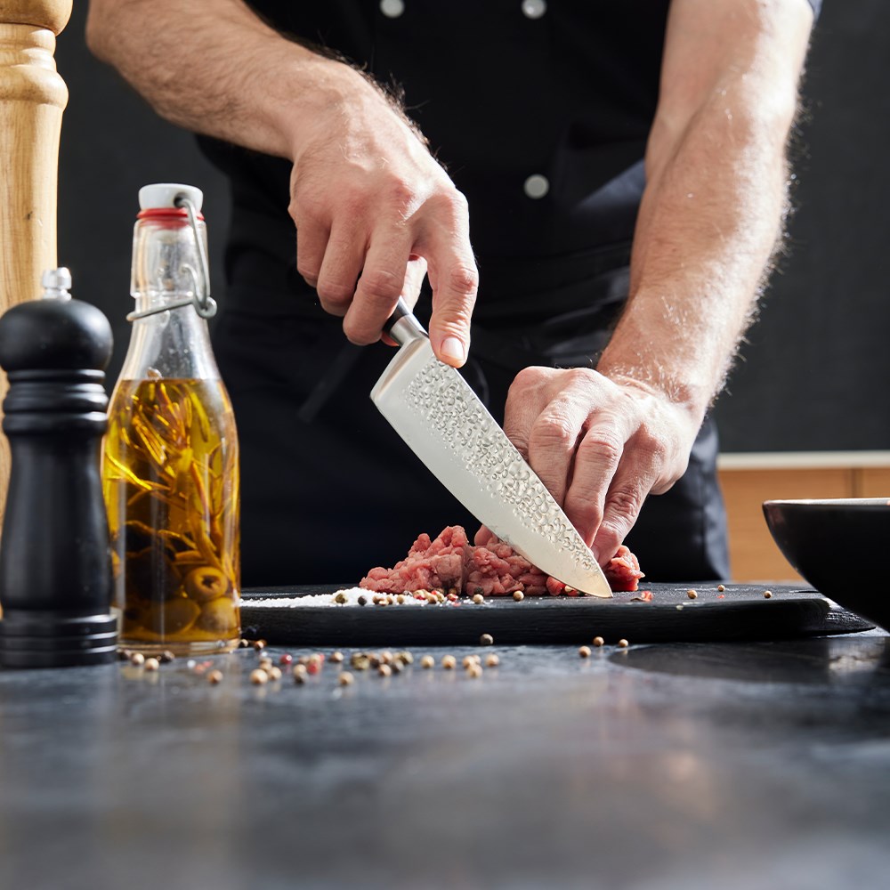 A standout feature of the Okito range of professional kitchen knives is the hammered metal finish which not only adds a striking visual appeal, but it also serves a practical function. The hammered texture creates small air pockets between the blade and the food, reducing drag and minimising instances of food sticking to the knife. This allows for faster, smoother cuts which is ideal for chefs working in high-speed, high-efficiency kitchens.