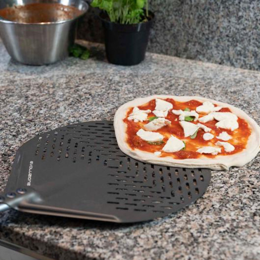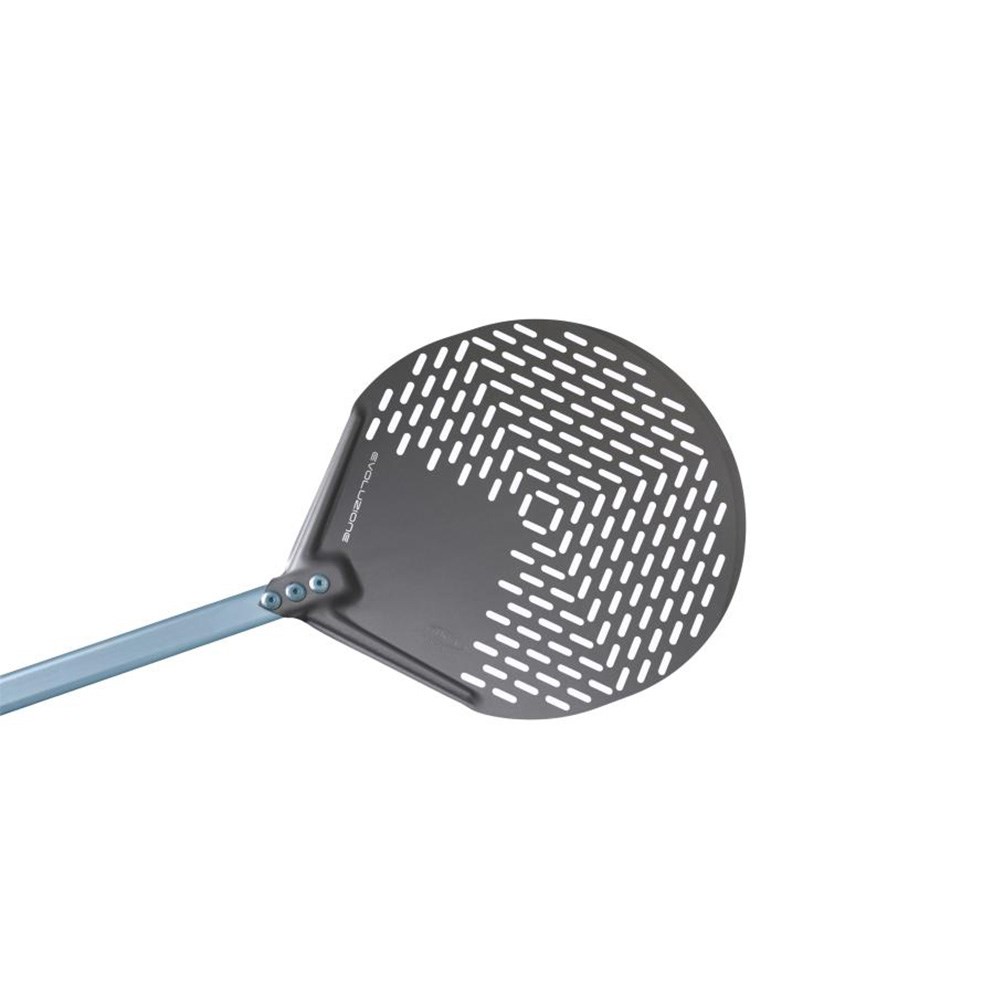 Made from stainless steel, the Evoluzione Round Perforated Pizza Peel offers strength, hygiene, and resistance to heat and corrosion. The perforated head features slim, evenly distributed slots that reduce weight while increasing smoothness and airflow, allowing excess flour to fall away for a perfectly baked pizza base every time. The stainless steel handle limits heat transfer from the oven. Its high-density polymer base and sliding grip ensure comfort, stability, and exceptional resistance to impact and temperature.