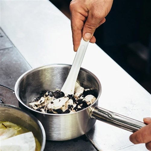 The Exoglass Straight Spatula 500mm White by Matfer Bourgeat is a premium utensil for the commercial foodservice operations. Constructed from Exoglass, this spatula is non-deformable, rot-proof, sterilisable, and rust-proof. Its non-porous surface prevents the absorption of odours and bacteria, ensuring compliance with strict hygiene and safety standards. With heat resistance up to 220°C, the spatula offers versatility for a wide range of culinary tasks. From stirring and mixing to spreading on delicate non-stick surfaces, it provides consistent performance.