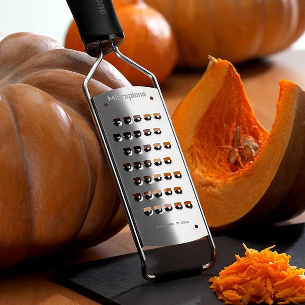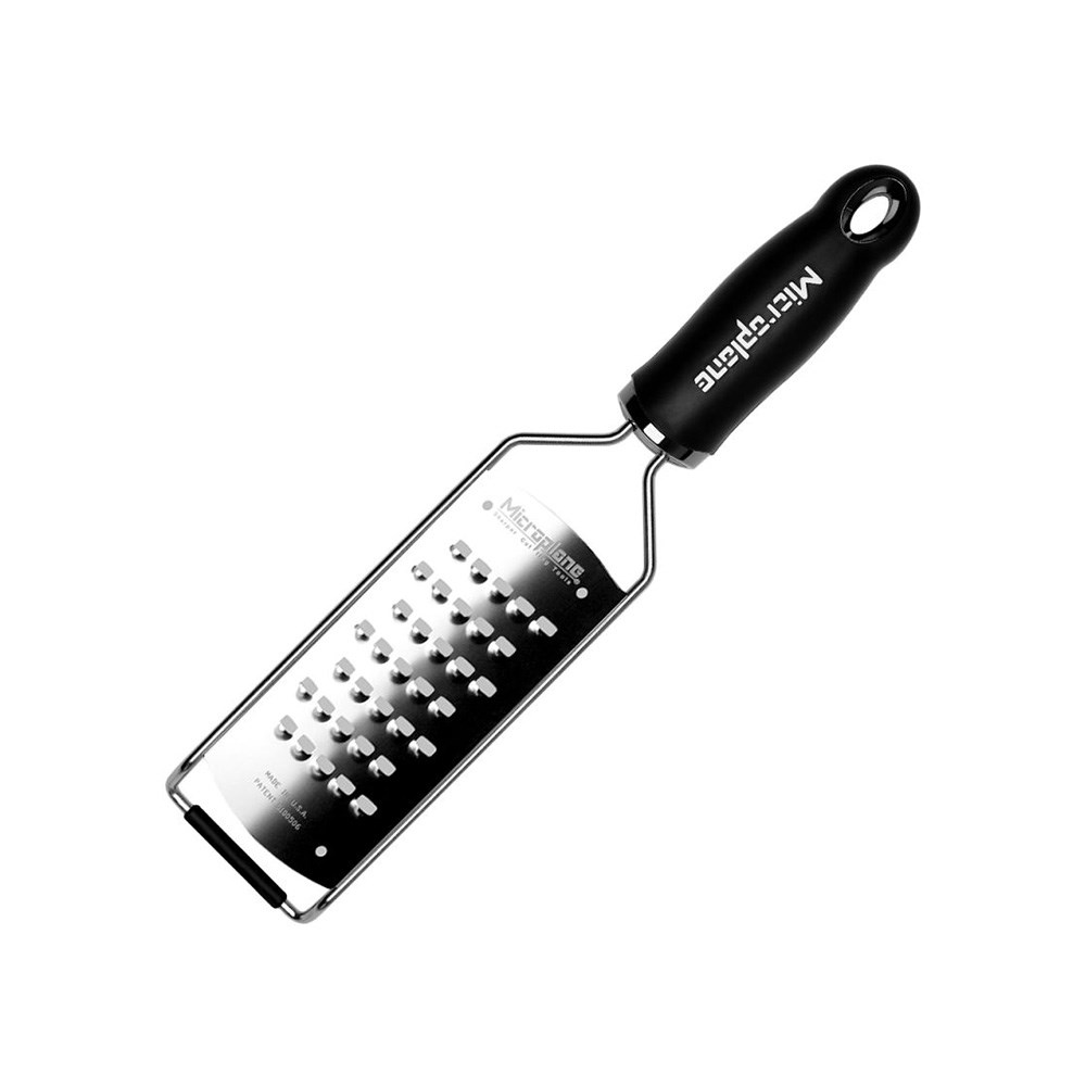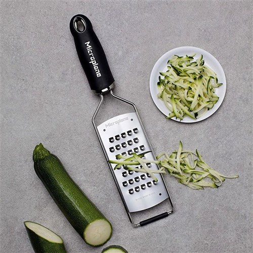 The Microplane Gourmet Series retain the clog-resistant stainless steel blade of Microplane graters, but with the addition of an angled, non-slip bar at the 'table end', improving leverage when grating Microplane graters feature photo-etched blade technology, ensuring effortless grating for superior results, cutting foods precisely without ripping or shredding Ergonomic soft-grip handle for stability and comfort, to maximise efficiency during use •Includes reusable plastic protective cover for safe storage and blade protection •The coarse grater is ideal for grating hard cheeses such as parmesan as well as a variety of fruits and vegetables including pears, apples, carrot, peppers and ginger