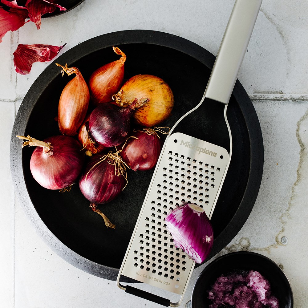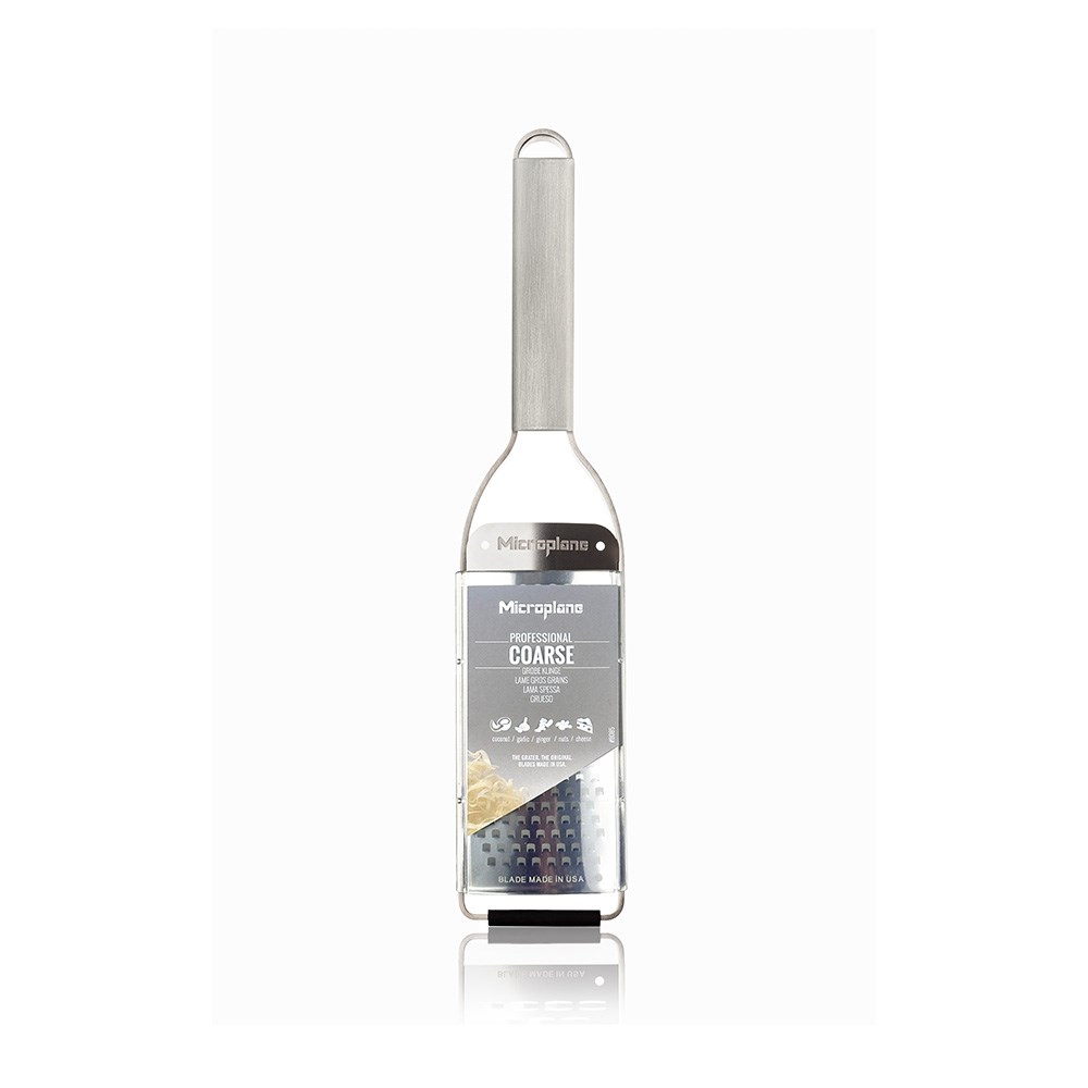 The coarse blade is ideal for grating hard cheeses, carrots, coconut, chocolate, nutmeg and other vegetables or firm ingredients. Designed for comfort and control, the Microplane Professional Course Grater offers an ergonomic stainless steel handle offers a secure grip during extended use, while the non-slip rubber feet improve stability and safety when grating directly over bowls, boards or benchtops. A built-in hanging loop allows for convenient storage, and the included reusable protective cover helps keep the blade protected between uses.