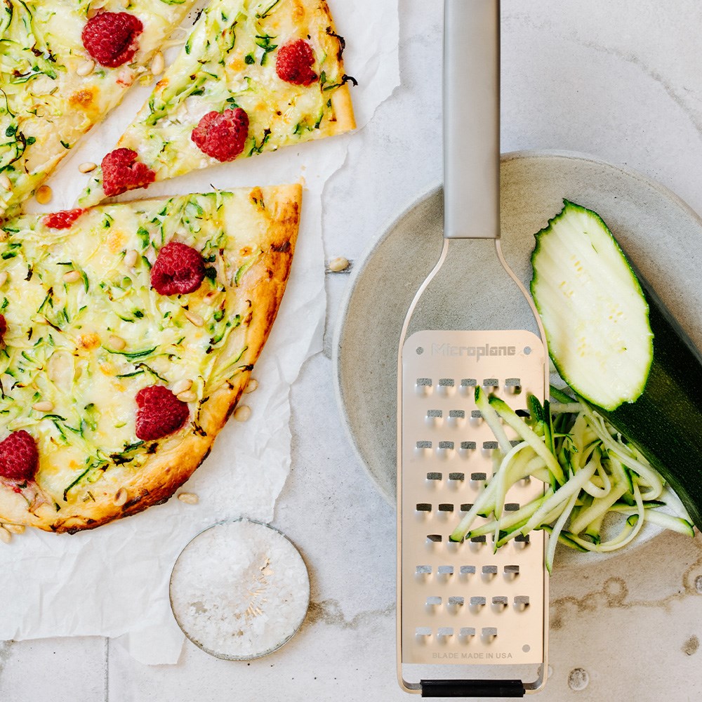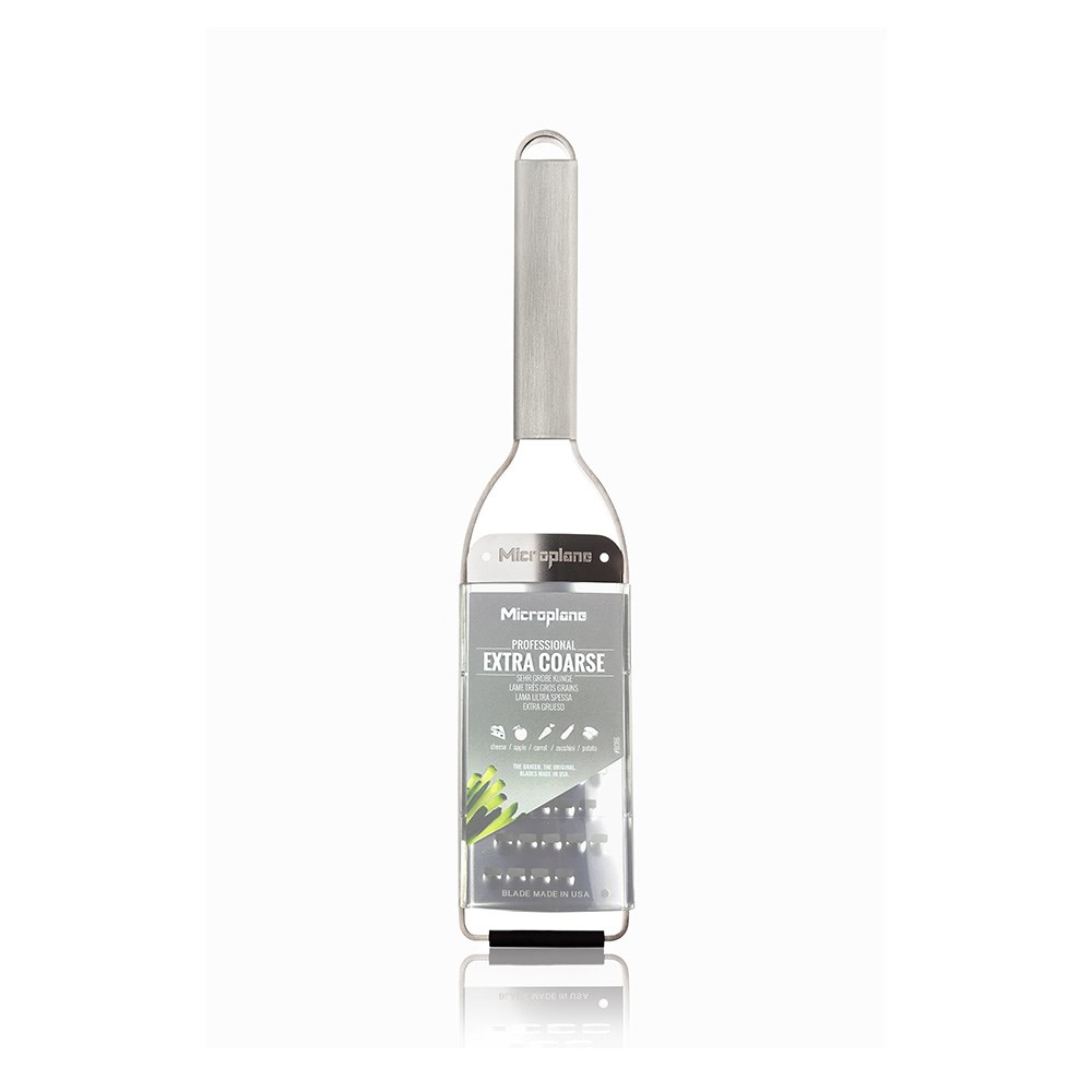 The coarse blade is ideal for grating hard cheeses, carrots, coconut, chocolate, nutmeg and other vegetables or firm ingredients. Designed for comfort and control, the Microplane Professional Extra Course Grater offers an ergonomic stainless steel handle offers a secure grip during extended use, while the non-slip rubber feet improve stability and safety when grating directly over bowls, boards or benchtops. A built-in hanging loop allows for convenient storage, and the included reusable protective cover helps keep the blade protected between uses.