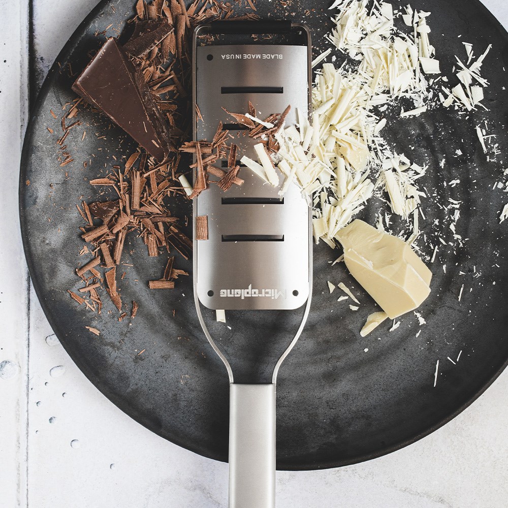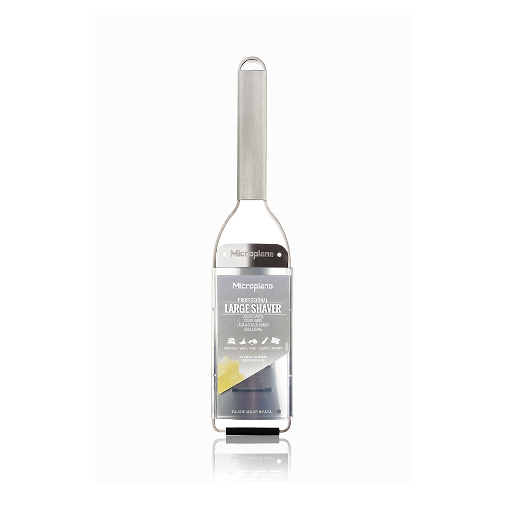 The large grater is perfect for grating grates wide but extremly fine shavings of cheese that can be perfectly used for garnishing verious appetizers and salads. Designed for comfort and control, the Microplane Professional Large Shaver Grater offers an ergonomic stainless steel handle offers a secure grip during extended use, while the non-slip rubber feet improve stability and safety when grating directly over bowls, boards or benchtops. A built-in hanging loop allows for convenient storage, and the included reusable protective cover helps keep the blade protected between uses.