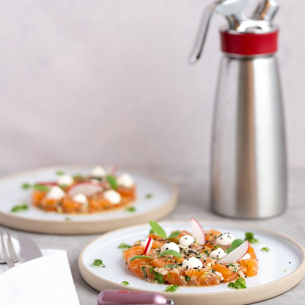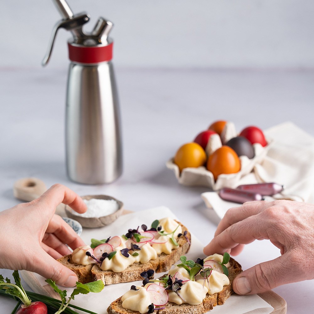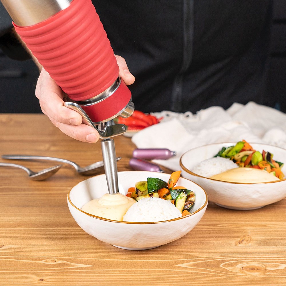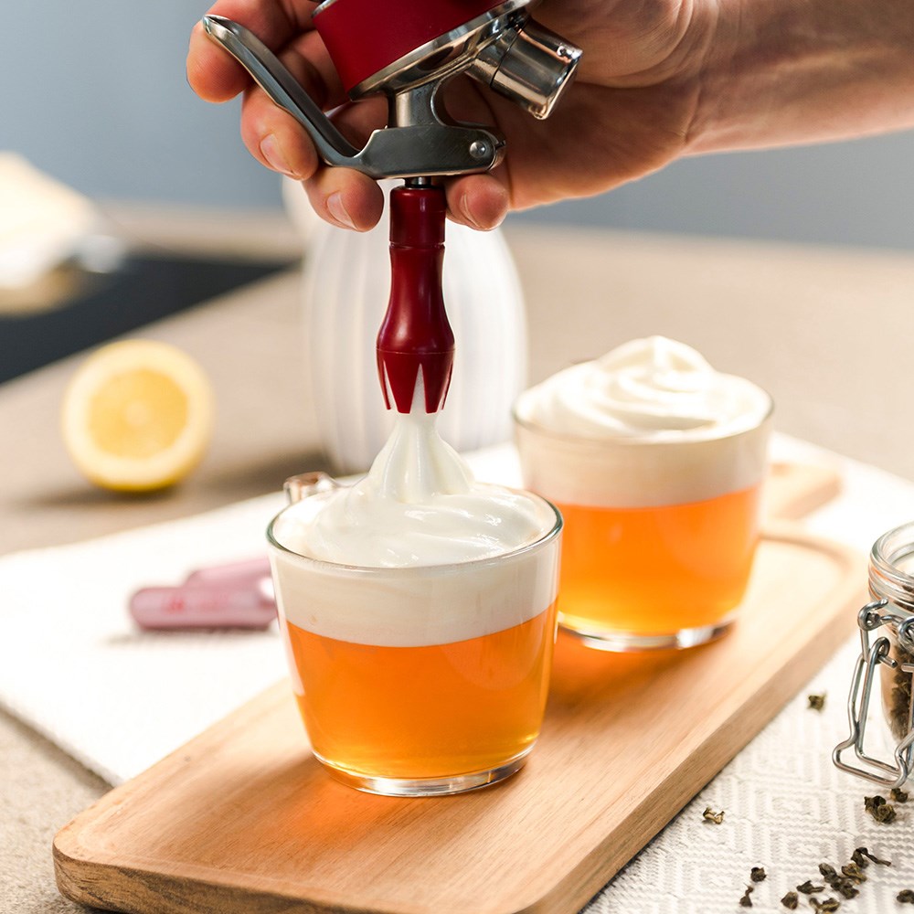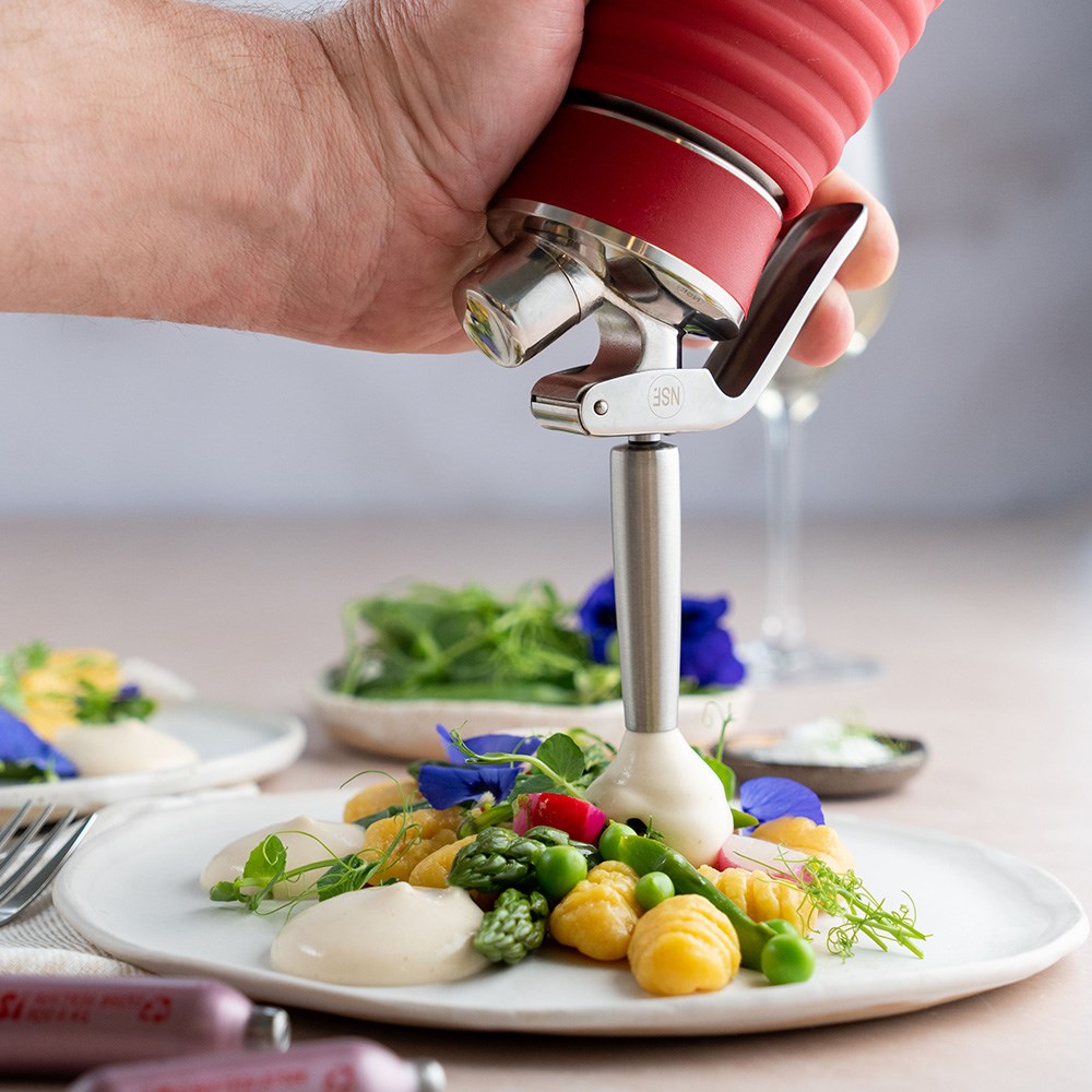 The iSi Gourmet Whip features a stainless steel head with a protective silicone grip, providing easy handling and preventing the bottle from slipping out of your hands. Its fixed stainless steel valve is suitable for hot preparations. It is also designed for easy liquid dispensing, and its heat-resistant silicone gasket is in place to prevent the seal from warping. Built from high-quality stainless steel, each cream whippers are built to last. iSi is the number one brand globally for culinary equipment.