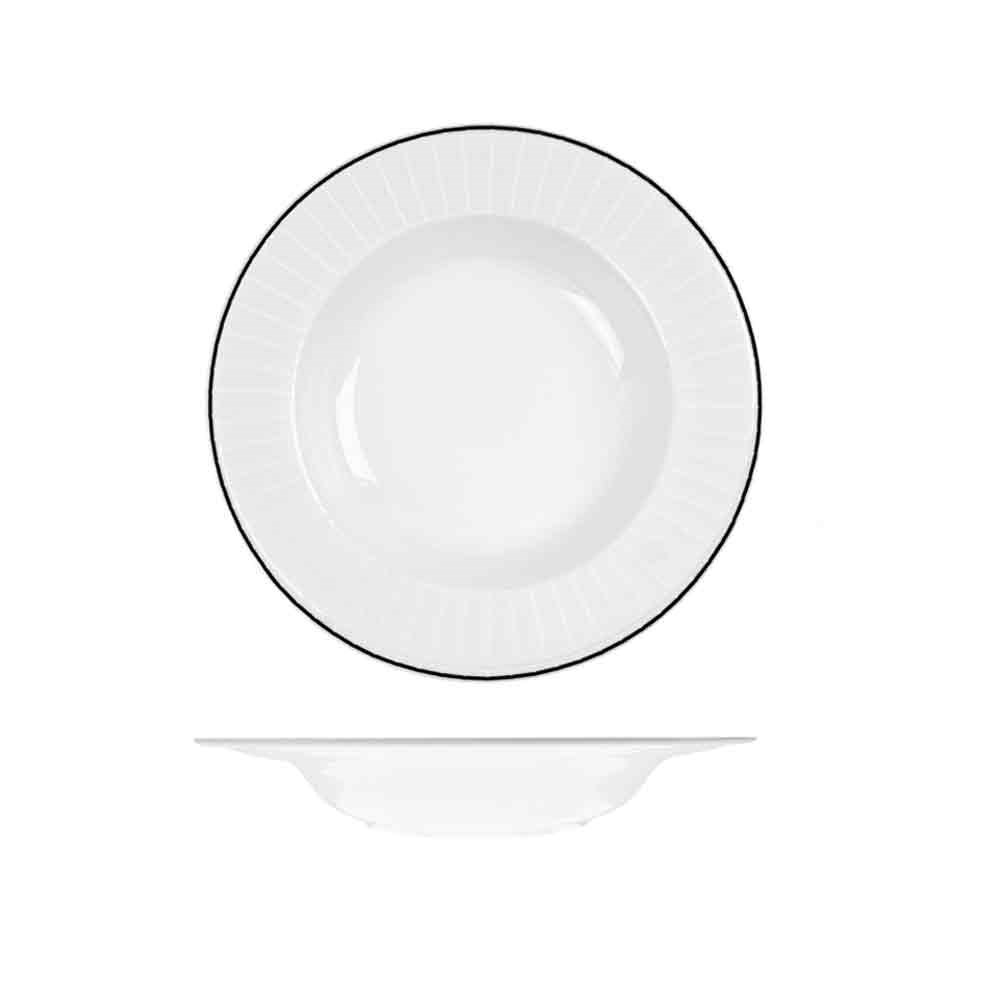 This Harriette 300mm Round Bowl by RAK Porcelain is a sophisticated and stylish choice for any dining setting. Featuring a crisp white surface with a sleek black line around the wide, panelled rims, this bowl adds a contemporary touch to any table. The generous 300mm size makes it ideal for serving large meals, shared plates, & banquet displays, while the refined design elevates the presentation of each dish.