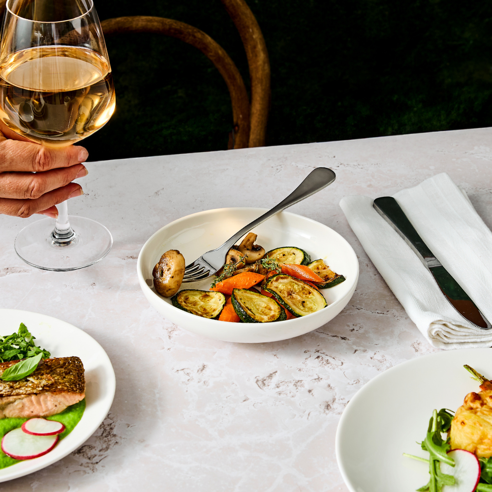 The Vibe Coupe Bowl White 180mm Accolade is designed to enhance food presentation with a refined, slim-profile. Its clean white finish provides a versatile backdrop for showcasing entrées, sides, desserts, or shared dishes. Manufactured with an alumina-rich body, this bowl delivers excellent strength and increased chip resistance. The fully glazed underbody is pin-fired to minimise scratching and abrasion during stacking and service. Superior heat retention allows food to remain at the desired temperature without crazing or dulling, supporting consistent presentation for both hot and cold menu items.