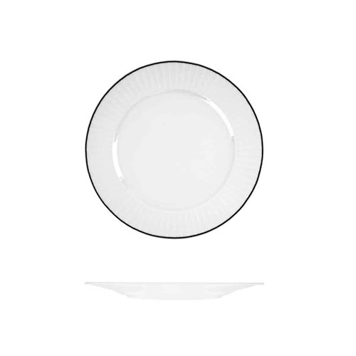 This Harriette 210mm Round Plate by RAK Porcelain is a sophisticated and stylish choice for any dining setting. Featuring a crisp white surface with a sleek black line around the wide, panelled rims, this plate adds a contemporary touch to any table. The generous 210mm size makes it ideal for serving entrees, meals, and side dishes, while the refined design elevates the presentation of each dish.