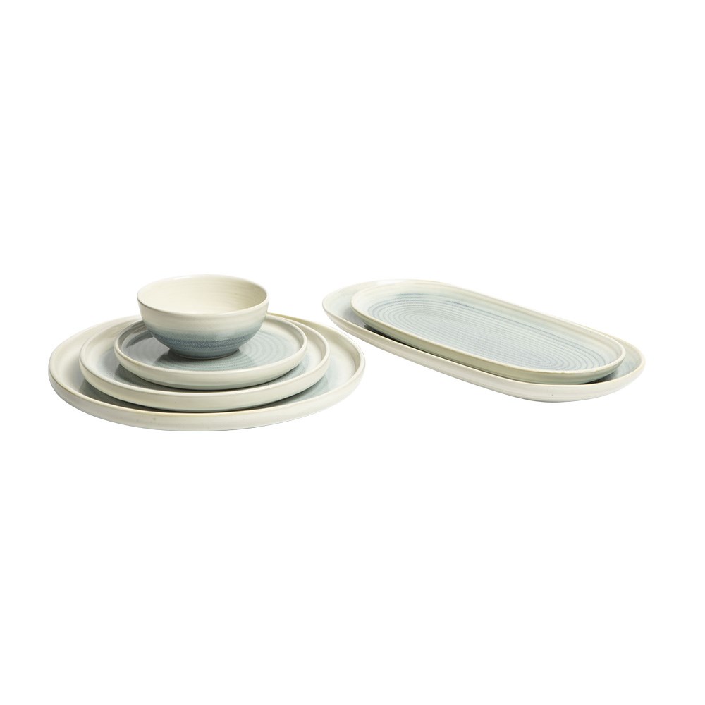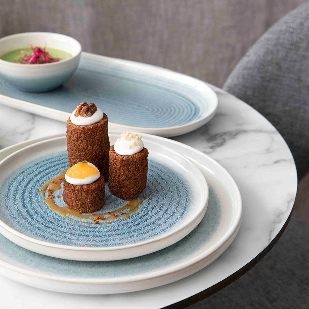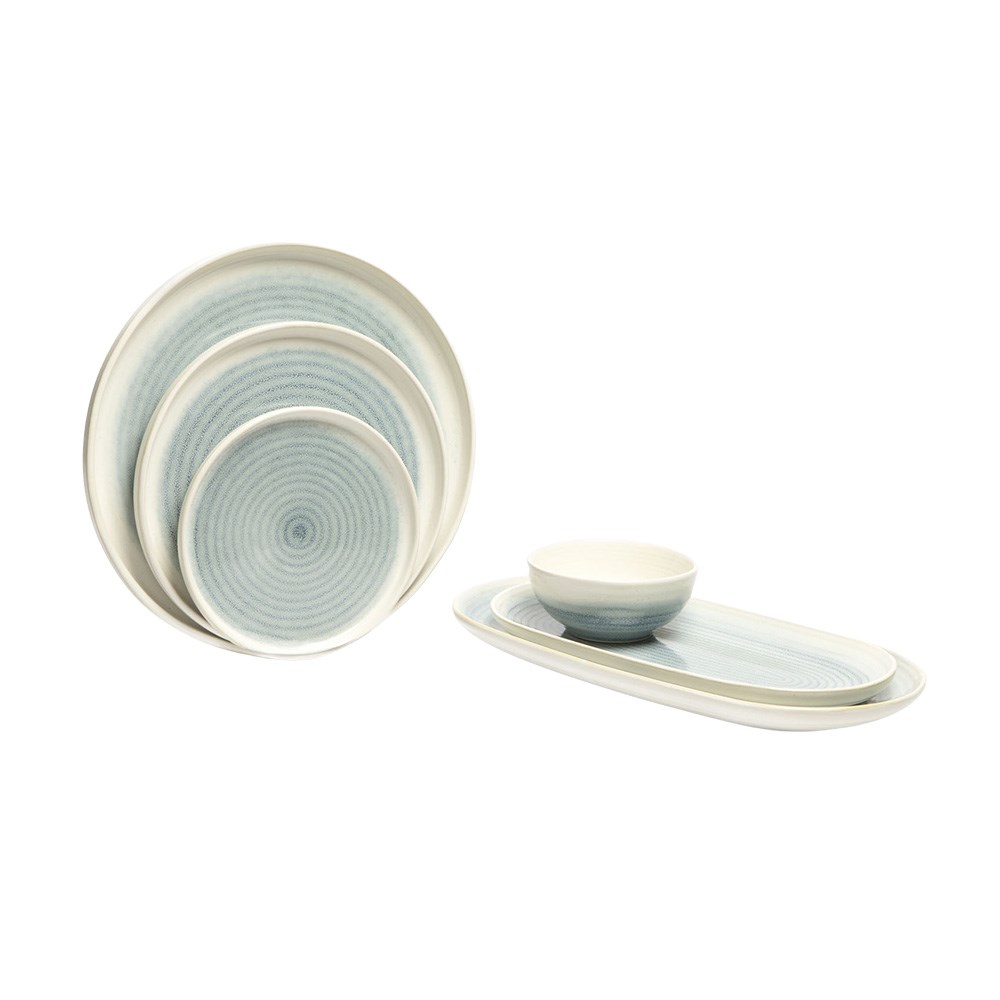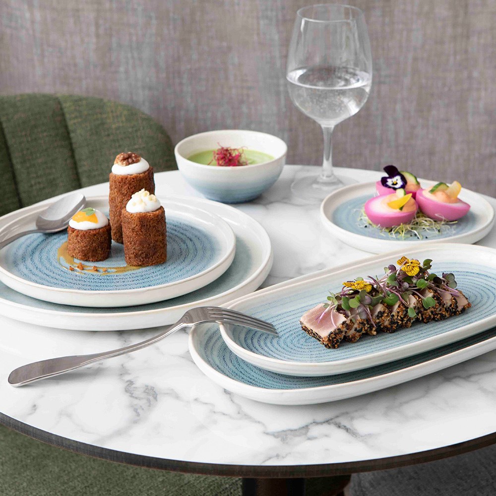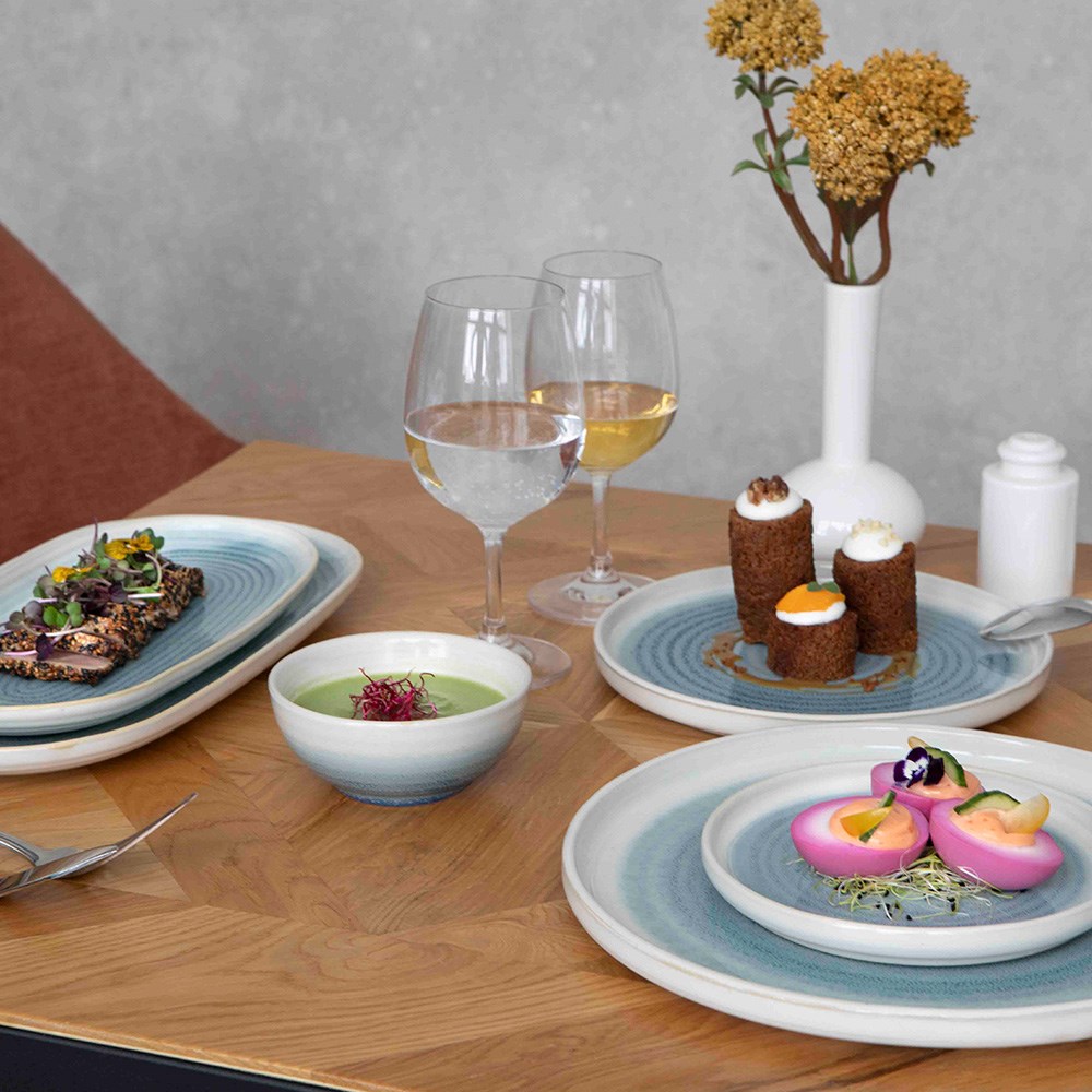 The Pro.mundi Pacific Oval Plate has a shiny finish that reflects light beautifully for a polished, elegant look. This also makes the surface easy to clean and resistant to staining. The plates are also dishwasher and microwave safe, offering convenience and easy maintenance for busy hospitality venues, like catering services, restaurants, resorts, and hotels. Each plate is unique due to the reactive glaze, giving the table a handcrafted feel that elevates the dining experience.