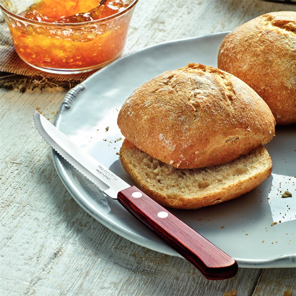 Made from German stainless steel, its serrated blade stays sharp with heavy use, while the temperature-resistant polywood handle offers comfort and control. This dishwasher-safe knife combines style and practicality for any table setting.