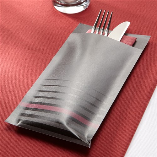 Add a touch of elegance to your table with the Isi Paper Cutlery Pouch Grey/Bordeaux 200x100mm by Pro.mundi. These stylish pouches feature a modern grey and bordeaux striped design and come with a matching 2-ply quilted napkin, offering both sophistication and functionality. The sleek grey and bordeaux colour combination adds a contemporary yet warm touch to your table setting, making it ideal for a variety of occasions.