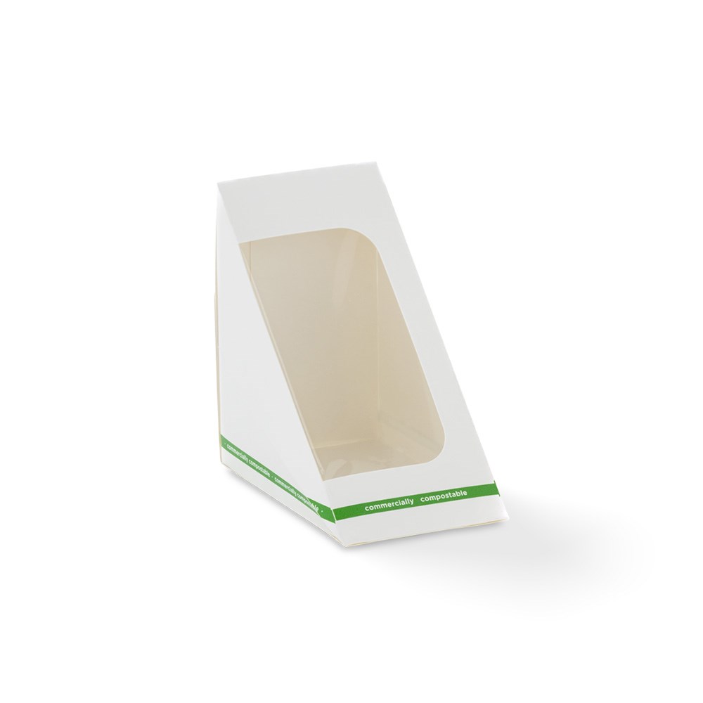 Pack different sandwiches using the Detpak On-The-Go Sandwich Wedge White. This sandwich wedge is ideal for cafés, bakeries, convenience stores, and food-to-go operators. The sandwich wedge is easy to assemble and use, supporting fast service in high-traffic environments. Its compostable PLA window provides clear visibility of contents, enhancing on-shelf appeal while maintaining a natural kraft look. An anti-tamper dagger closure helps keep food secure during handling and transport.
