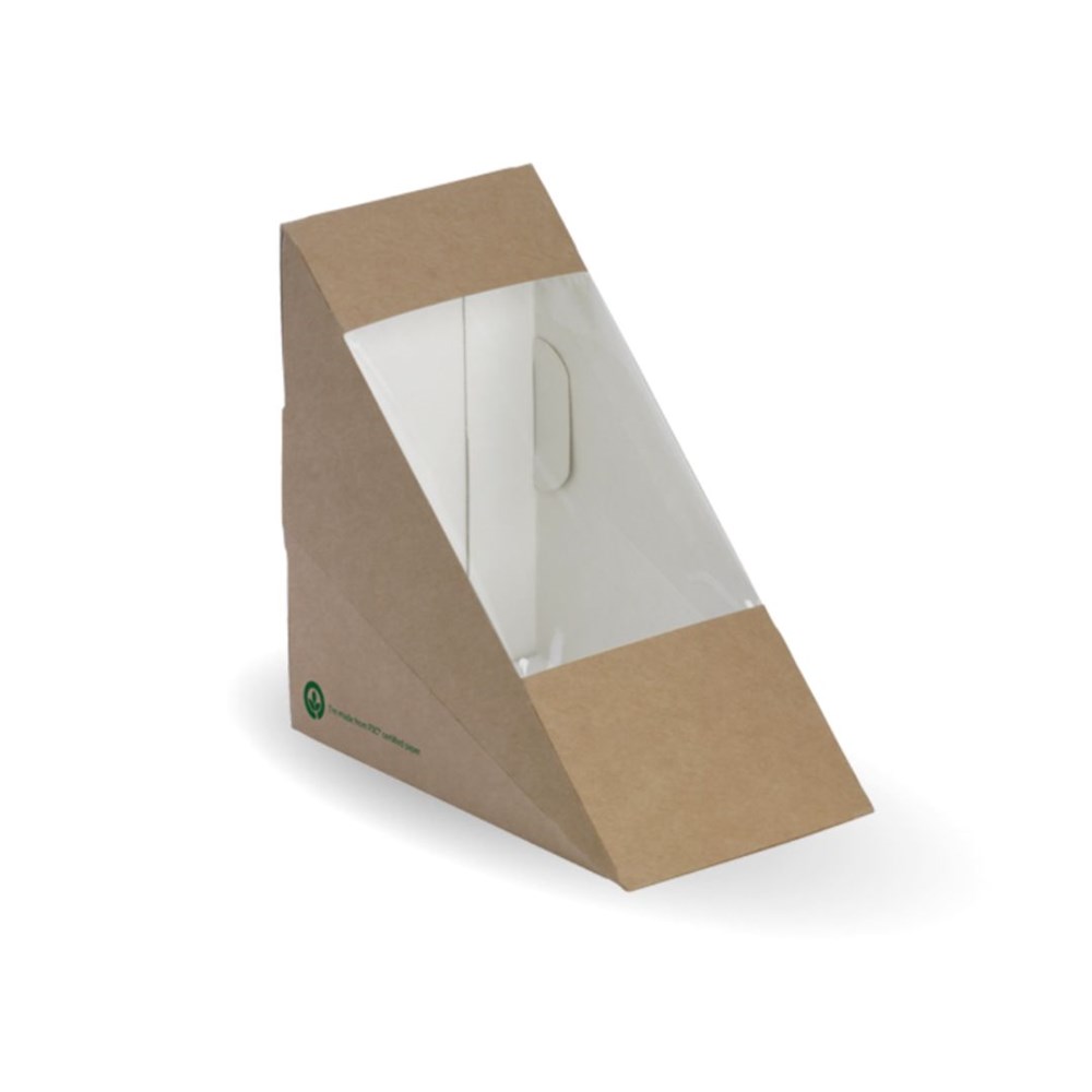 BioBoard Wedge Medium Brown 123x72x123mm BioPak is an eco-friendly sandwich box made from FSC™ Mix certified paper board. It features a waterproof bioplastic window, ensuring that your sandwiches stay fresh while providing visibility. The box is printed with a kraft-look design for a natural, appealing presentation.