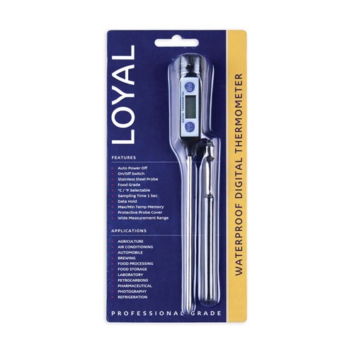 The waterproof digital thermometer is ideal for commercial kitchens. With the thermometer's auto-calibration and min/max features, users can quickly verify and quantify temperature. With it's reduced tip it is ideal for inserting into thin food.